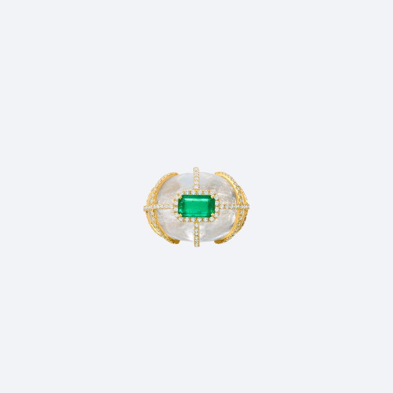 Cristal de rocha, esmeralda, diamantes e ouro amarelo 18k.