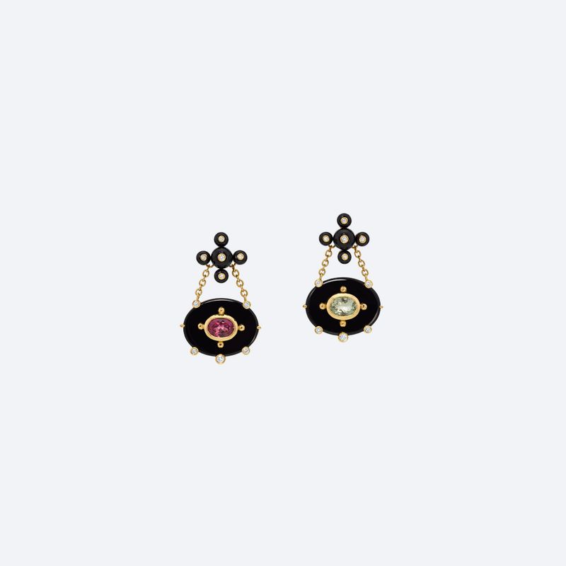 Ônix, rodolitas, prasiolitas, diamantes e ouro amarelo 18k.