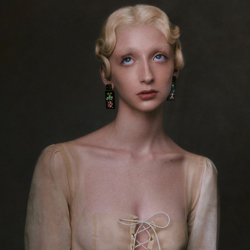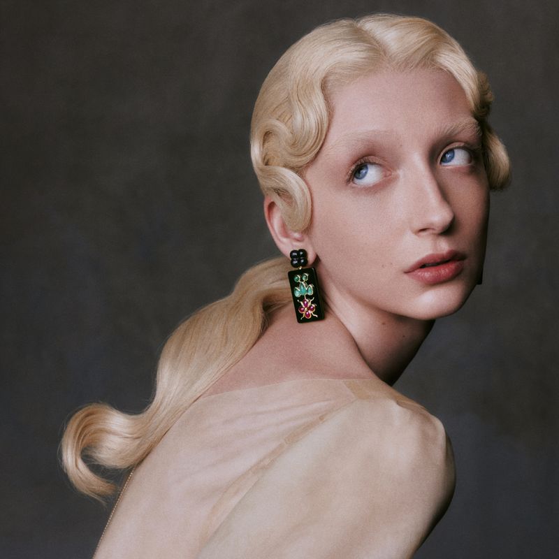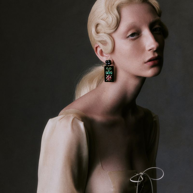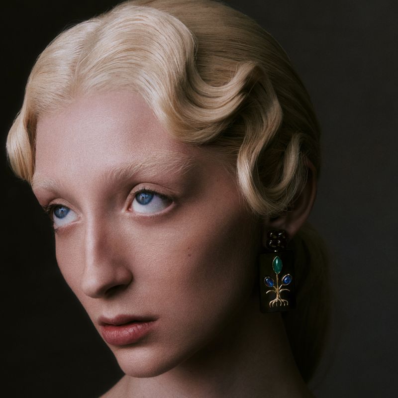 Esmeralda, rubi, safira, chifre e ouro amarelo 18k.