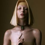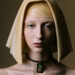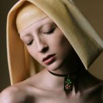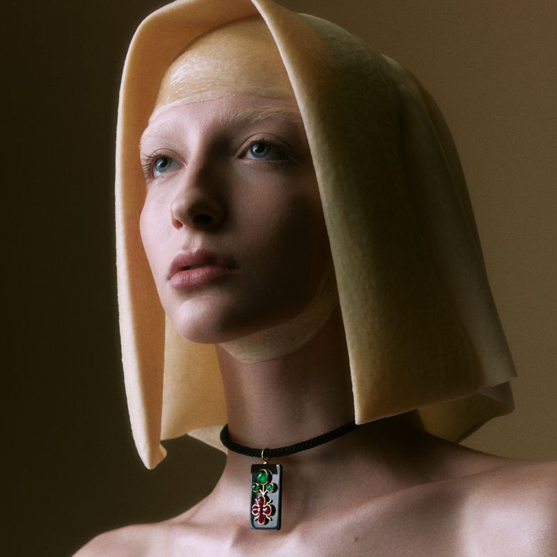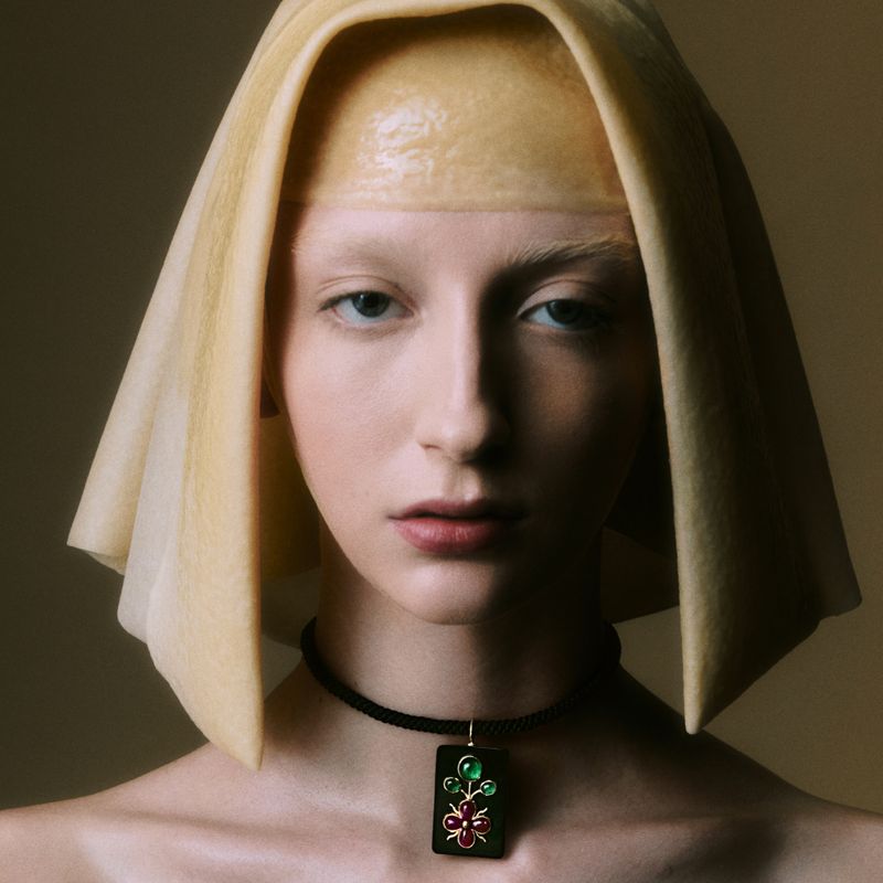 Esmeralda, rubi, chifre e ouro amarelo 18k.