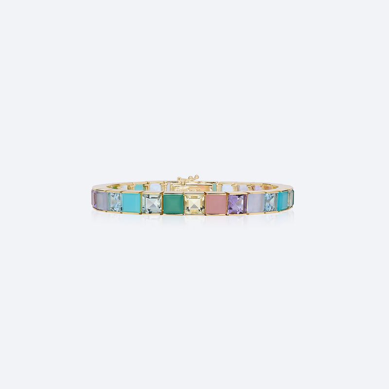 Ágata azul, ágata verde, quartzo goiaba, topázio azul, ametista, calcedônia, prasiolita, quartzo green gold e ouro amarelo 18K.